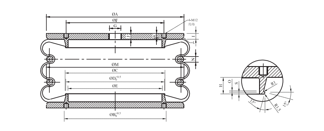 自封式,是因其無需外力自行密封而得名。如圖,用纖維層做補強處理的橡膠曲囊①在使用時,將防止膨脹的鋼制(鍍鋅)腰環(huán)②嵌在其中。③蓋板的端部鋼絲圈借助空氣內(nèi)壓的作用,使橡膠口部發(fā)生變形與上下蓋板(鍍鋅)④密切接觸,從而可防止空氣泄漏。上下蓋板④通過機械加工成型。⑤是用于安裝進氣管路的管螺紋進氣孔,⑥則是安裝用的標(biāo)準(zhǔn)螺紋孔。